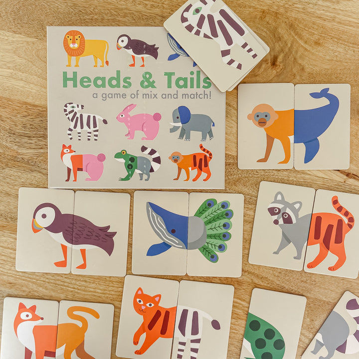 For younger babies and children show them the cards and practice the animal sounds. As they get older they will be able to say the animals' names and match the correct heads and tails.