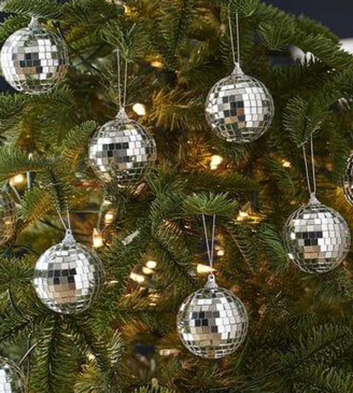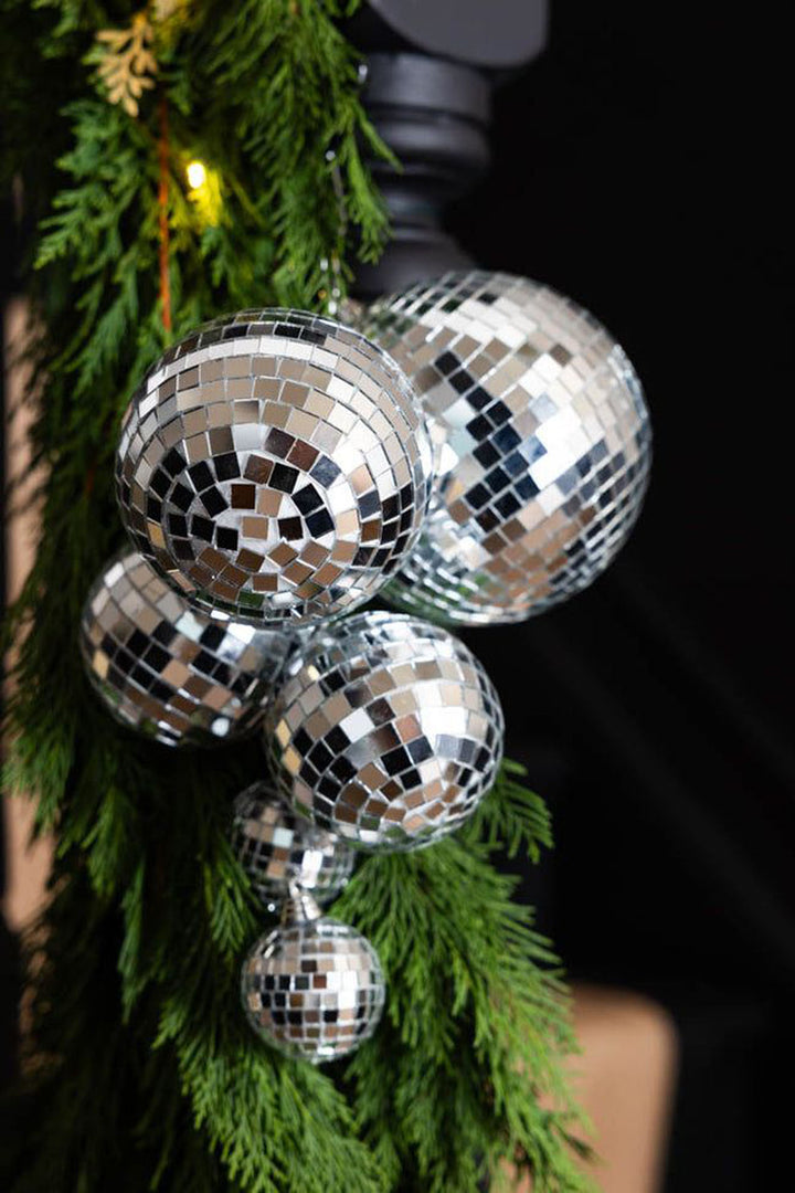 Lightweight polystyrene balls covered with silver mirror tiles, with a ring in the top to easily hang.